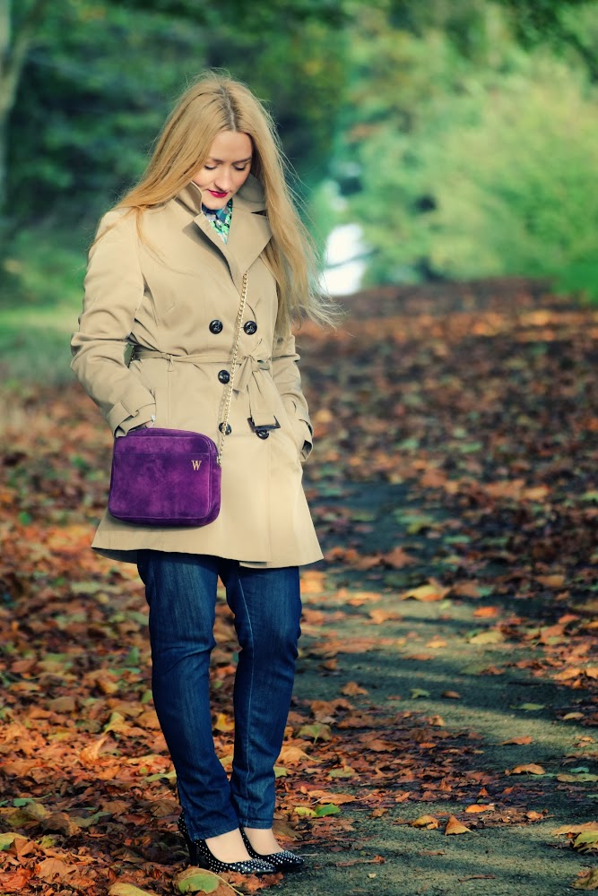 Beautiful pictures! I love how they turned out and that purple bag is gorgeous. I love the pop of color with the trench.